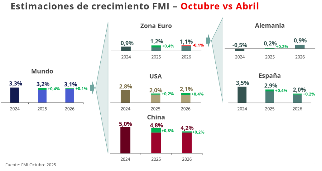 Pese a esta pérdida de impulso, las previsiones para 2026 siguen siendo razonablemente positivas. El FMI revisó al alza sus proyecciones en octubre: espera que el mundo crezca un 3,2% en 2025 y un 3,1% en 2026. En Estados Unidos el crecimiento previsto se sitúa en el 2,0% y 2,1% respectivamente. También mejoran las perspectivas para China, la zona euro y España, que lidera el crecimiento entre las economías desarrolladas con un 2,9% estimado para 2025. Alemania, por su parte, podría beneficiarse del cambio de régimen fiscal y del plan de estímulo en marcha.