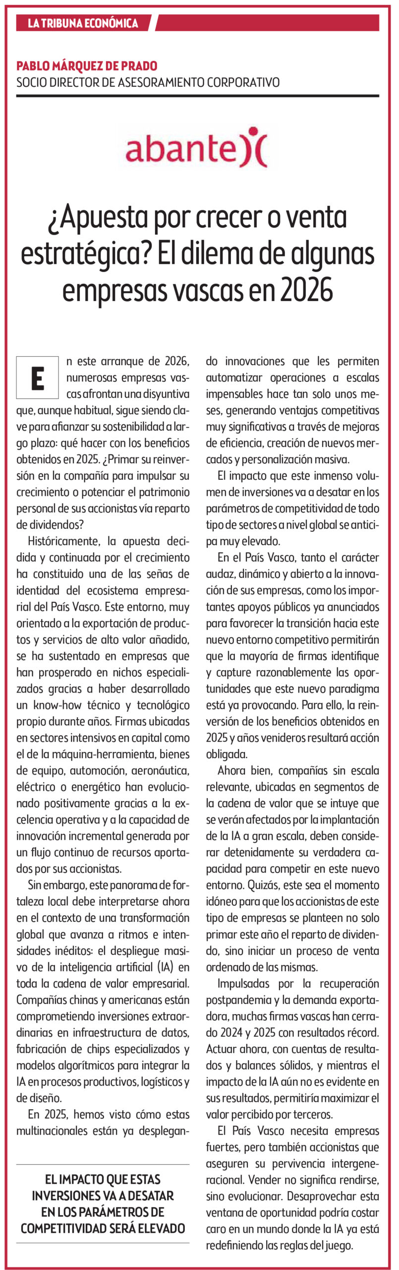 Pablo Márquez de Prado, socio de Asesoramiento corporativo de Abante, escribe una tribuna en El Correo  bajo el título: «¿Apuesta por crecer o venta estratégica? El dilema de algunas empresas vascas en 2026». Una reflexión sobre la necesidad de tomar decisiones estratégicas en un nuevo contexto marcado por la inteligencia artificial.