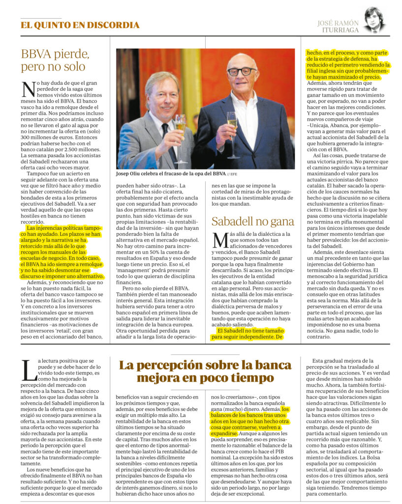 José Ramón Iturriaga, socio y gestor de fondos en Abante, escribe en El quinto en discordia en ABC: «BBVA pierde, pero no solo», «Sabadell no gana» y «La percepción sobre la banca mejora en poco tiempo».