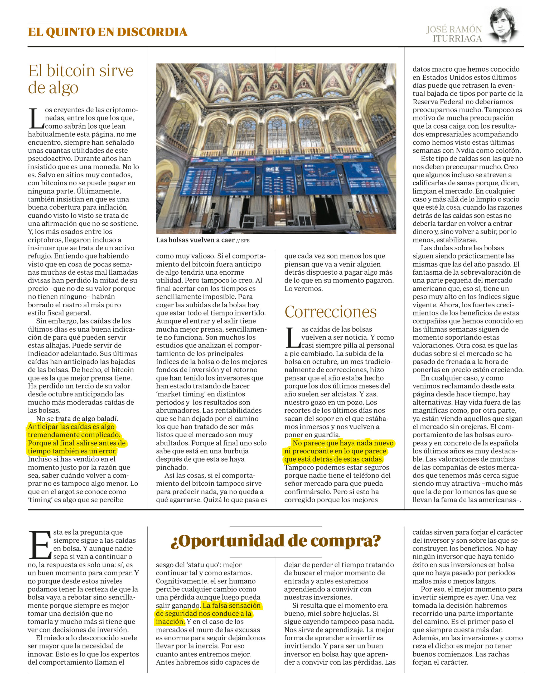 José Ramón Iturriaga, socio y gestor de fondos en Abante, escribe en El quinto en discordia en ABC: «El bitcoin sirve de algo», «Correciones» y «¿Oportunidad de compra?».