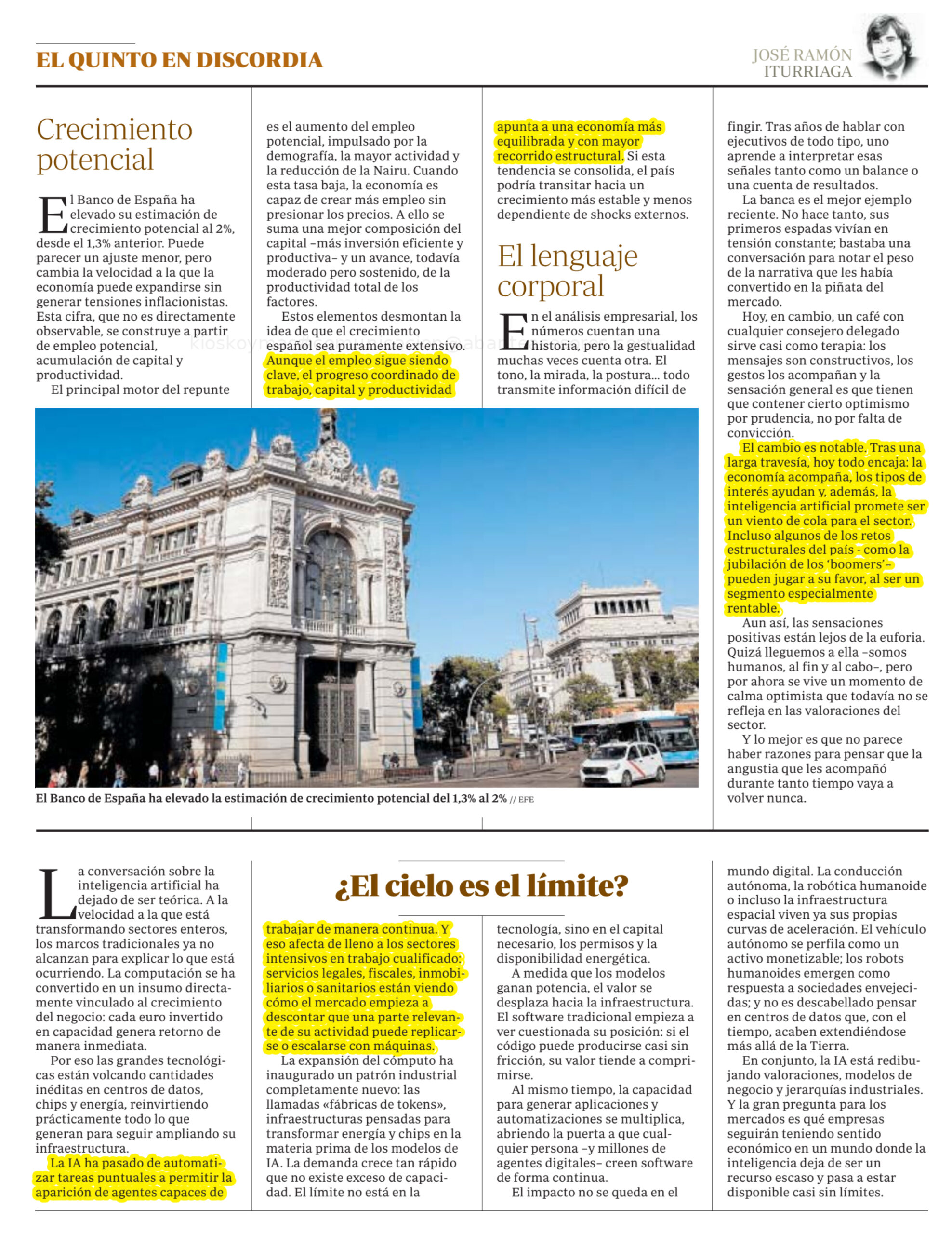 José Ramón Iturriaga, socio y gestor de fondos en Abante, escribe en El quinto en discordia en ABC: «Crecimiento potencial», «El lenguaje corporal» y «¿El cielo es el límite?».