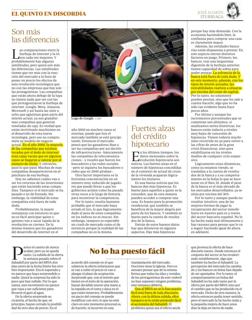 José Ramón Iturriaga, socio y gestor de fondos en Abante, escribe en El quinto en discordia en ABC: «Son más las diferencias», «Fuertes alzas del crédito hipotecario» y «No lo ha puesto fácil».