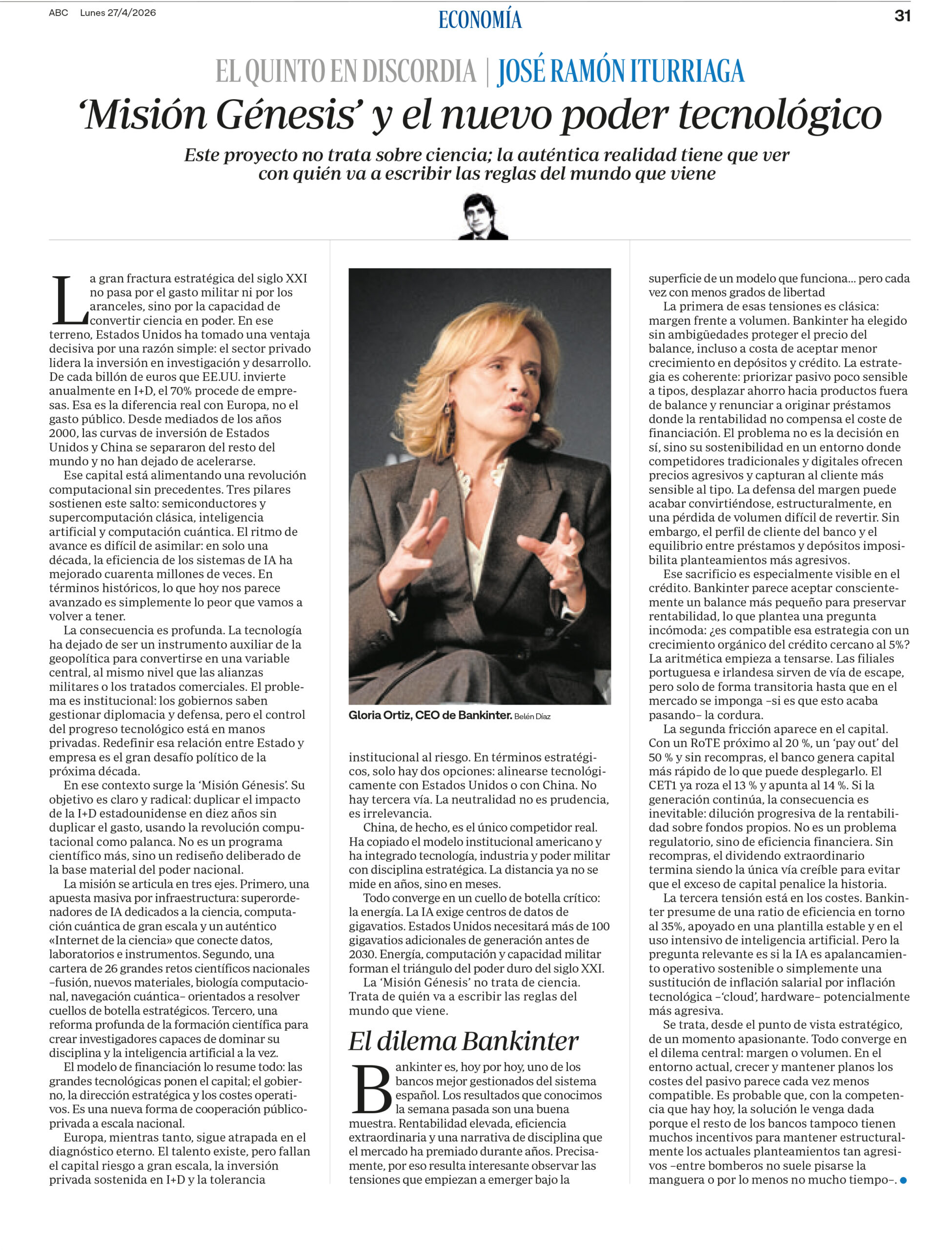 José Ramón Iturriaga, socio y gestor de fondos en Abante, escribe en El quinto en discordia en ABC: «Misión Génesis y el nuevo dilema tecnológico» y «El dilema Bankinter».