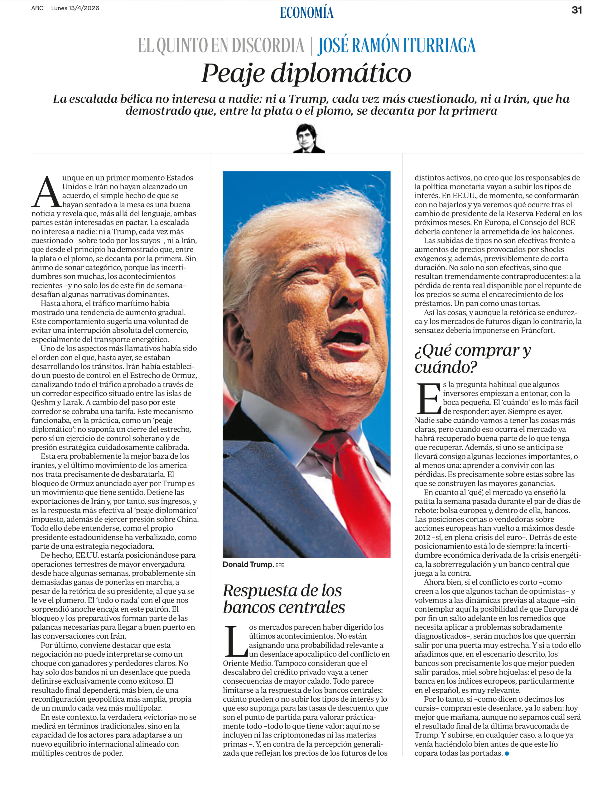 José Ramón Iturriaga, socio y gestor de fondos en Abante, escribe en El quinto en discordia en ABC: «Peaje diplomático», «Respuesta de los bancos centrales» y «¿Qué comprar y cuándo?».