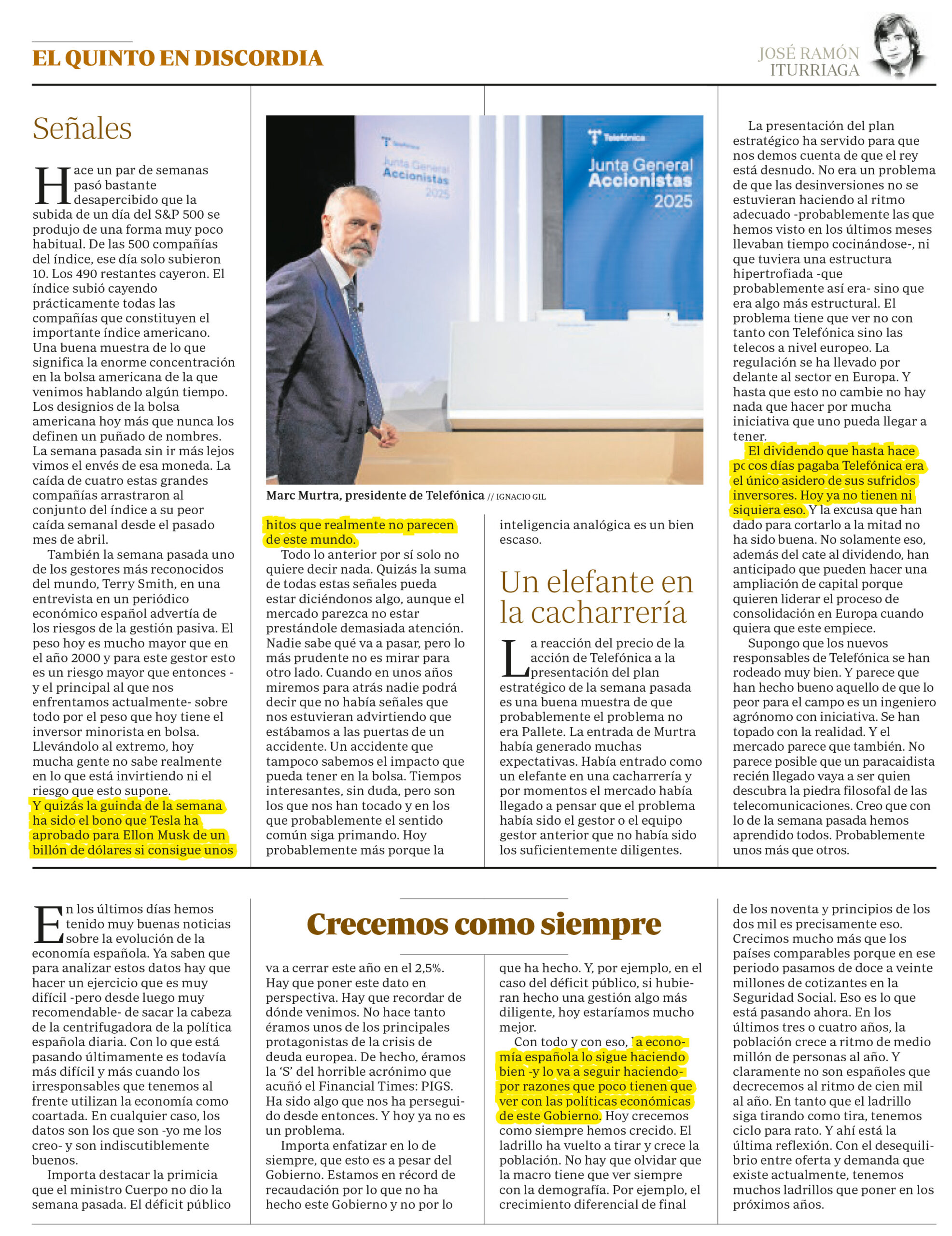 José Ramón Iturriaga, socio y gestor de fondos en Abante, escribe en El quinto en discordia en ABC: «Señales», «Un elefante en la cacharrería» y «Crecemos como siempre».
