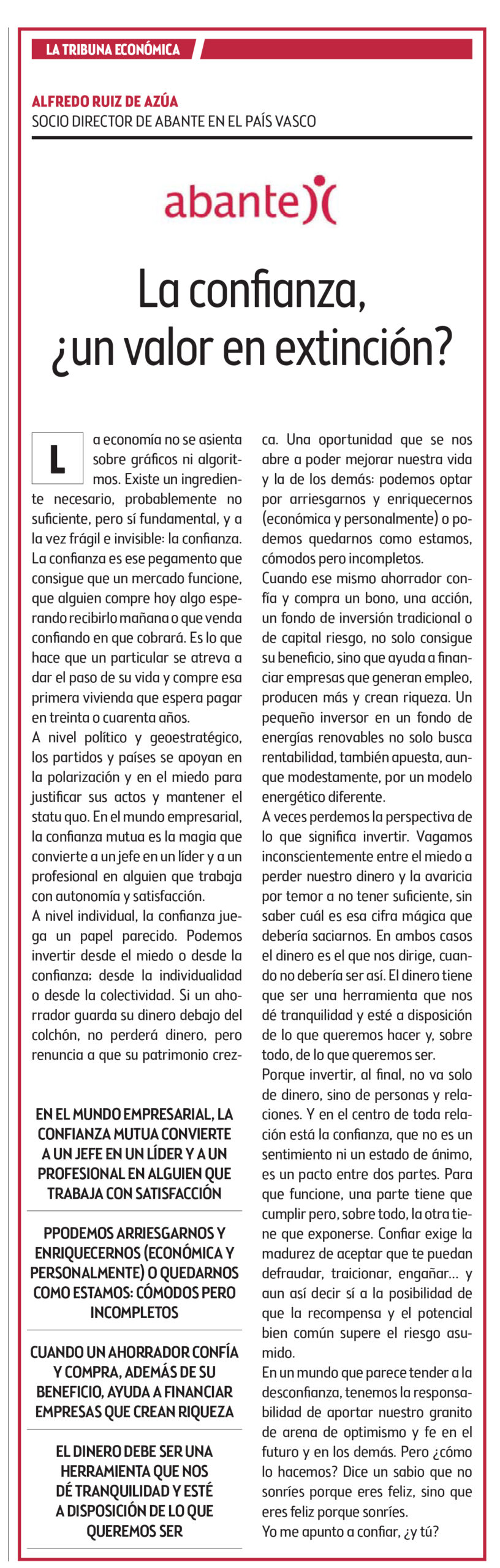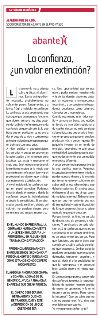 Alfredo Ruiz de Azúa, director de Abante en el País Vasco, escribe una tribuna en El Correo bajo el título «La confianza, ¿un valor en extinción?». Una reflexión sobre cómo la confianza mutua y las relaciones sólidas son la base para que un mercado funcione.