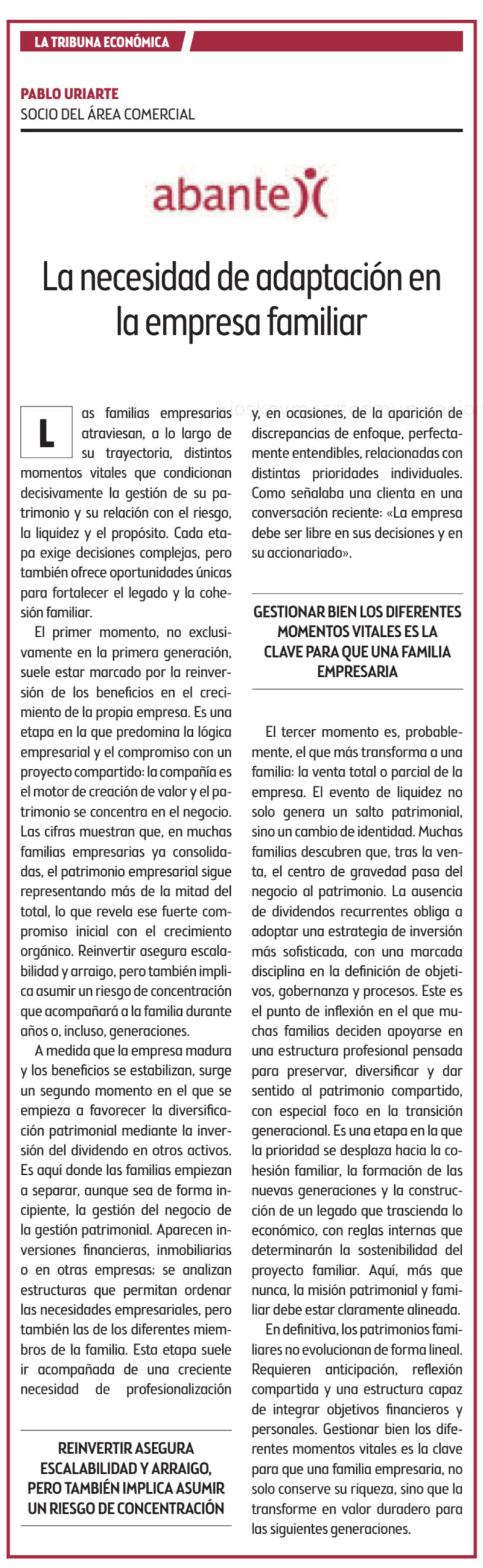 Pablo Uriarte, socio del área comercial de Abante, escribe una tribuna en El Correo bajo el título «La necesidad de adaptación en la empresa familiar». Una reflexión sobre cómo la empresa familiar debe adaptarse a cada etapa vital, profesionalizar su gestión y ordenar su patrimonio con visión de largo plazo para preservar y transformar su riqueza en valor duradero para las siguientes generaciones.