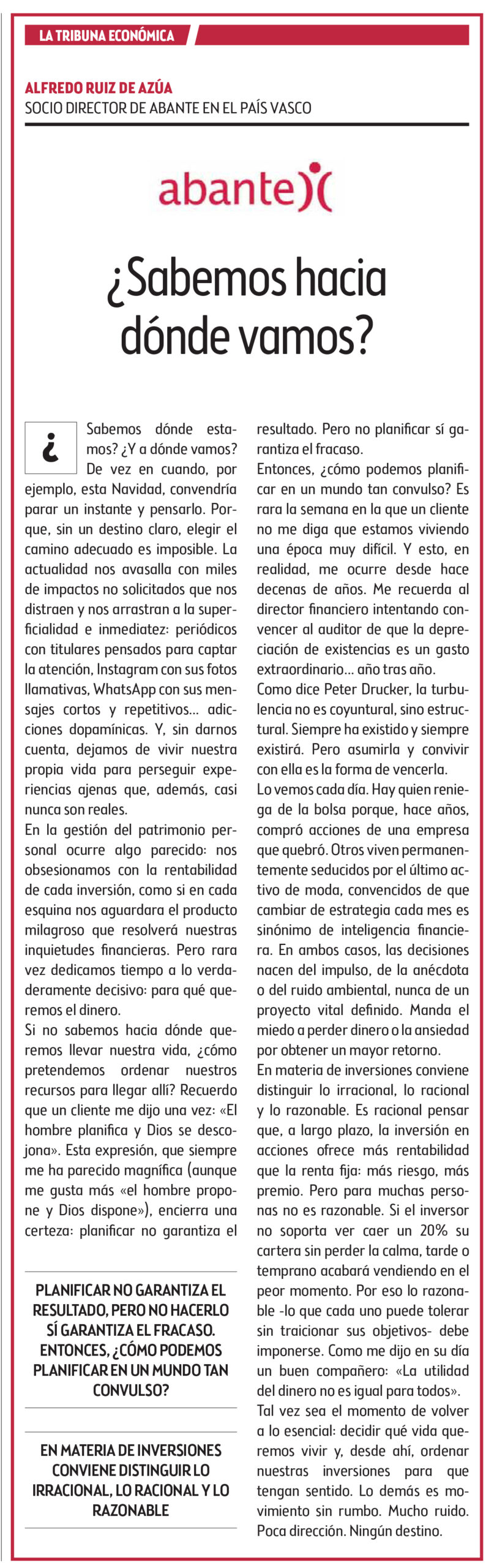 Alfredo Ruiz de Azúa, director de Abante en el País Vasco, escribe una tribuna en El Correo bajo el título «¿Sabemos hacia dónde vamos?». Una reflexión sobre cómo reenfocar nuestras decisiones financieras partiendo de lo verdaderamente importante: la vida que queremos vivir.